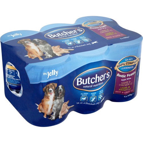 Butchers Rustic Feasts in Jelly is a complete nutritious pet food for your adult dog! With over 25 years’ experience, and developed with leading nutritionists, Butchers develop fantastic tasting, nutritious food products for dogs of all breeds and sizes!Rustic Feasts is made with the freshest and most natural ingredients, producing a tantalising tasty product for your dog! The high meat content in this dog food provides your dog with high proportion of Protein which is especially important for growth and repair! It also contains all the vitamins and minerals your dog needs! There are no artificial flavourings, colourings or preservatives in this food confirming to you that this is a very fresh product for your special dog! Even dogs with the most sensitive stomachs will love Butchers Rustics Feasts in Jelly as its Gluten free! The meals included in this pack are:Butcher’s Made with Fresh Lamb & KidneyButcher’s Made with Fresh Beef & LiverButcher’s Made with Fresh Chicken & Game.Ingredients:With Game & Chicken: Meat & Animal Derivative (47%, of which Game 9%, Chicken 9%, Fresh 29%), Minerals,With Lamb & Kidney: Meat & Animal Derivatives (47%, of which Lamb 9%, Kidney 9%, Fresh 23%),Minerals,With Beef & Liver: Meat & Animal Derivatives (47%, of which Beef 9%, Liver 9%, Fresh 23%), Minerals.Nutritional Additives:Vitamins: Vit A (E672) 1250 I.U., Vit D3 (E671) 250 I.U. Trace Elements (mg/kg): Zinc Sulphate Monohydrate (E6) 57, Manganese Sulphate Monohydrate (E5) 8, Calcium Iodate Anhydrous (E2) 0.82, Sodium Selenite Anhydrous (E8) 0.67.Analytical Constituents: Protein 7.5%, Crude Fibre 0.2%, Fat Content 5%,Crude Ash 1.7%, Moisture 83%.