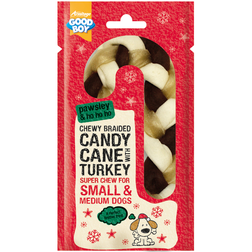 The Good Boy Pawsley Candy Cane With Turkey Super Chew will go down a treat with your dog this Christmas. This braided treat is turkey flavoured and sure to set tails wagging!Length: 22.5cm