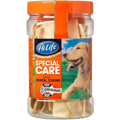 Your vet knows only too well the importance of healthy teeth and gums. Left unchecked, a dogs normal diet can lead to tartar build-up which in turn can cause inflammation and pain in the teeth and gums.Independent evidence shows that daily use of Chews like HiLife Special Care Daily Dental Chews can reduce tartar build-up, help keep teeth and gums clean and healthy, and keep breath fresh. And because its natural for a dog to chew, you can be sure that your dog will enjoy these chews much more than using a toothbrush!HiLife Special Care Daily Dental Chews are made from natural hide which means they may vary in size, shape and colour. HiLife Special Care Daily Dental Chews are completely digestible and high in protein. Feeding Guide: Feed at least one chew daily.Never leave your dog unattended with any toys, treats or chews. Do not feed on carpets or other stainable surfaces. HiLife recommend that these chews should not be fed to puppies under 6 months (larger breeds) or 9 months (smaller breeds).