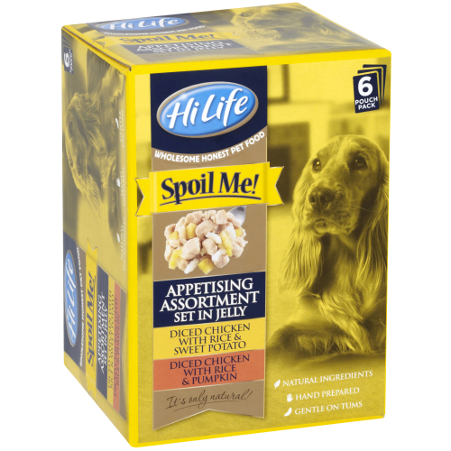 HiLife Spoil Me Appetising Assortment Set in Jelly for Dogs has been created using simply the best quality human-grade ingredients and absolutely no artificial additives. The result is a delicious all-natural recipe for which your dog is sure to love you.This is a complementary pet food for adult dogs. In the box: x3 pouches Diced chicken, rice and potato x3 pouches Diced chicken, rice and pumpkinIngredients: Diced Chicken with Rice & Sweet Potato: Chicken Breast (50%), Rice (10%), Sweet Potato (4%), Minerals. Diced Chicken with Rice & Pumpkin: Chicken Breast (50%), Rice (10%), Pumpkin (4%), Minerals.Protein 10.5%, Fat Content 1.0%, Crude Fibres 0.5%, Inorganic Matter 2.0%, Moisture 83.0%.