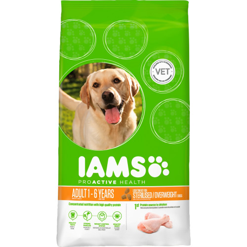 The delicious Iams Chicken Light for Overweight/Sterilised Adult Dog food is especially formulated to support a change in diet without neglecting the flavour or nutritional value. Providing support to 7 vital health concerns; digestion, muscles, heart, weight, immune system, skin and coat and bones the Iams recipe helps support your dog’s wellbeing whilst they adjust to a new lifestyle. So whilst your dog devours the crunchy kibble you can be sure that they are getting the best food they need which lets you focus on creating a world of doggy happiness. 7 Signs of Health VitalityDigestion: Fibre blend including prebioticsMuscles: Protein to help build strong firm musclesHeart: 7 Essential NutrientsWeight: Formulated to gradually return your dog to a healthier weightImmune System: Antioxidant blend for healthy immune systemSkin and Coat: Omega 6 and Omega 3Bones: Essential minerals to help maintain strong bonesSuitable for: Dogs with a tendency to be overweight, 1+ YearIngredients: Chicken 17%, Wheat, Barley, Animal Fat, Sorghum, Dried Beef Pulp 3%, Hydrolysed Animal Proteins, Dried Whole Egg, Brewer’s Dried Yeast, Calcium Carbonate, Potassium Chloridem Sodium Chloride, Sodium Hexametaphosphate, Fructooligosaccharides 0.14%, Dicalcium Phosphate, Linseed.Typical Analysis: Fat Content 20%, Crude Ash 6.6%, Crude Fibres 3.0%, Calcium 1.1%, Phosphorus 0.80%, Moisture 8.0%, Omega-6 1.91%, Omega-3 0.13%.Nutritional Analysis: Vitamin A, Vitamin D, Vitamin E, L-Carnitine, Trace Elements Contain Ferrous Sulphate Monohydrate, Zinc Oxide, Manganous Oxide, Manganous Sulphate Monoyhdrate, Cupric Sulphate Pentahydrate, Potassium Iodide, baisx Cobaltous Carbonate Monhydrate.