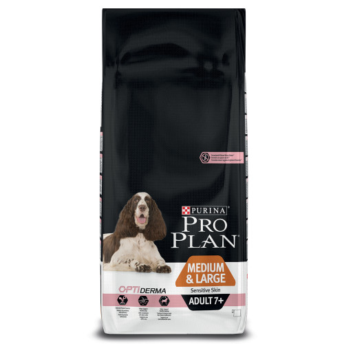 PRO PLAN Adult 7+ salmon & rice dog food is carefully formulated to ease irritation for older dogs with a tendency to itch and scratch. A complete pet food with higher levels of Omega 3 fatty acids, designed to minimise discomfort associated with sensitive skin and protect your dog from the elements.PRO PLAN salmon and rice dog food is made with high quality salmon as the main ingredient alongside controlled protein sources such as corn and rice, which is ideal for more sensitive dogs. Working outside and in, PRO PLAN Sensitive is rich in antioxidants like vitamins C & E to help your dog remain bright eyed and bushy tailed well into their old age!• Salmon, the avoidance of wheat, and increased omega fatty acid levels support a healthy, glossy skin and coatIngredients Salmon (17%), Rice (16%), Maize, Dehydrated salmon protein, Maize gluten  meal, Maize grits, Dried beet pulp, Dried egg, Animal fat, Maize starch, Minerals, Dried chicory root, Digest, Soybean oil, Fish oil.Analytical Constituents Protein 27.0%, Fat content 13.0%, Crude ash 7.0%, Crude fibres 3.0%. Nutritional additives IU/kg: Vit. A: 30 000; Vit. D3: 975; Vit. E: 650. mg/kg: Vit. C: 165; Ferrous sulphate monohydrate: 314; Calcium iodate anhydrous: 4.0; Cupric sulphate pentahydrate: 63; Manganous sulphate monohydrate: 150;, Zinc sulphate monohydrate: 530; Sodium selenite: 0.37. With antioxidants.