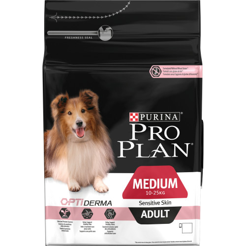 PRO PLAN for sensitive skin with OPTIDERMA is a delicious salmon recipe for medium (10 – 25kg) sized adult dogs. Clinically proven to help keep dogs’ skin healthy, this food contains OPTIDERMA, a carefully selected combination of nutrients that target the skin, minimising skin problems caused by food sensitivities and bringing out your dog’s inner shine. With salmon as a high quality source of protein, this food works to keep your pet bright eyed and bushy tailed.• Salmon, the avoidance of wheat, and increased omega fatty acid levels support a healthy, glossy skin and coat• Selected cuts of salmon as the first ingredient produce a product with great palatability, digestibility, and nutrient quality• Prebiotics help to improve digestive health, producing good stool qualityIngredientsSalmon (14%), Rice (14%), Maize, Dehydrated Salmon Protein, Maize Gluten Meal, Maize Grits, Soya Meal, Animal Fat, Digest, Dried Beet Pulp, Dried Egg, Maize Starch, Minerals, Fish Oil, Dried Chicory Root, Soybean Oil.Analytical ConstituentsProtein: 27.0%, Fat content: 15.0%, Crude ash: 7.5%, Crude fibres: 3.0%, Additives: , Nutritional Additives IU/kg:, Vit. A: 30 000, Vit. D3: 975, Vit. E : 200, mg/kg:, Vit C: 120, Ferrous sulphate monohydrate: 210, Calcium iodate anhydrous: 2.7, Cupric sulphate pentahydrate: 42, Manganous sulphate monohydrate: 100, Zinc sulphate monohydrate: 357, Sodium selenite: 0.24. With antioxidants.